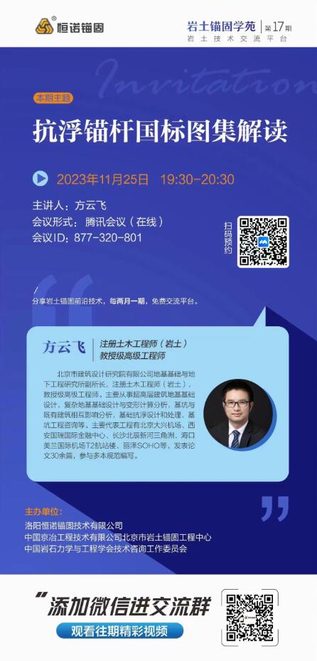 巖土錨固學(xué)苑將于2023年11月25日(周六)19:30-20:30舉辦第17期,本期主題:抗浮錨桿國(guó)標(biāo)圖集解讀,歡迎廣大巖土錨固領(lǐng)域愛好者參與交流。
