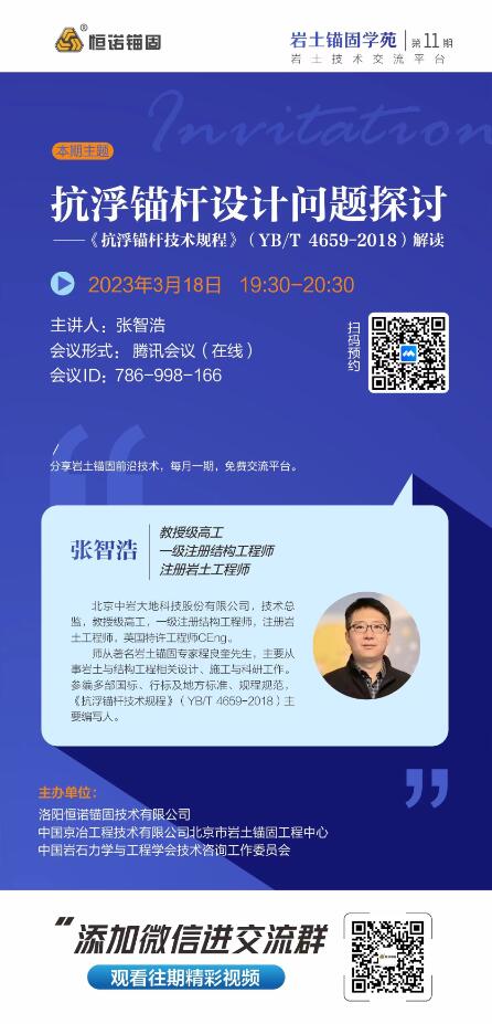 巖土錨固學(xué)苑是由洛陽恒諾錨固技術(shù)有限公司、中國京冶工程技術(shù)有限公司北京市巖土錨固工程中心和中國巖石力學(xué)與工程學(xué)會技術(shù)咨詢工作委員會聯(lián)合舉辦的線上交流研討會,兩月一期邀請行業(yè)內(nèi)不同專家學(xué)者線上分享巖土錨固的技術(shù)、工藝、產(chǎn)品、應(yīng)用等,旨在為廣大巖土領(lǐng)域人士提供免費(fèi)的學(xué)習(xí)平臺,增進(jìn)巖土錨固專家、學(xué)者、從業(yè)人員之間的互動交流。
