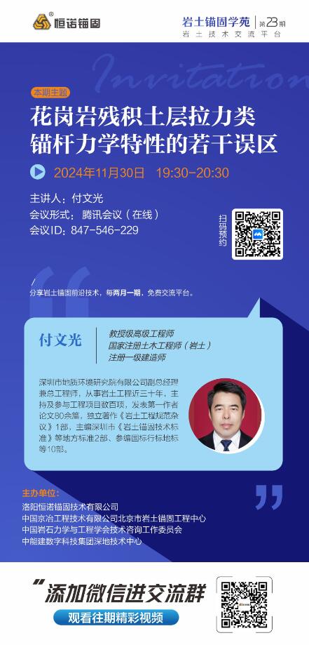 巖土錨固學(xué)苑是由洛陽(yáng)恒諾錨固技術(shù)有限公司、中國(guó)京冶工程技術(shù)有限公司北京市巖土錨固工程中心、中國(guó)巖石力學(xué)與工程學(xué)會(huì)技術(shù)咨詢工作委員會(huì)和中能建數(shù)字科技集團(tuán)深地技術(shù)中心聯(lián)合舉辦的線上交流研討會(huì),兩月一期邀請(qǐng)行業(yè)內(nèi)不同專家學(xué)者線上分享巖土錨固的技術(shù)、工藝、產(chǎn)品、應(yīng)用等,旨在為廣大巖土領(lǐng)域人士提供免費(fèi)的學(xué)習(xí)平臺(tái),增進(jìn)巖土錨固專家、學(xué)者、從業(yè)人員之間的互動(dòng)交流。