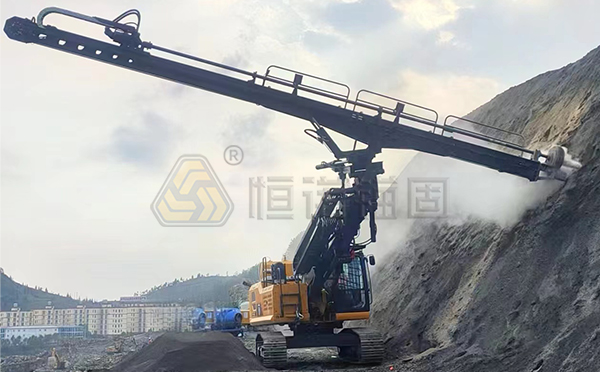 高舉鉆機(jī)舉升高度在9-40米,采用整體集成結(jié)構(gòu),由行走系統(tǒng)、動(dòng)力系統(tǒng)、液壓操控系統(tǒng)、舉升系統(tǒng)和鉆進(jìn)系統(tǒng)五大部分組成。高舉鉆機(jī)可以搭配不同動(dòng)力頭,用以匹配不同施工工藝的鉆進(jìn)施工,如潛孔鉆進(jìn)、跟管鉆進(jìn)、螺旋鉆進(jìn)、頂錘方式鉆進(jìn)等。高舉鉆機(jī)主要適用于鐵路、公路、水電站等大型高邊坡支護(hù)、危巖體加固工程,或大型隧道工程施工使用。